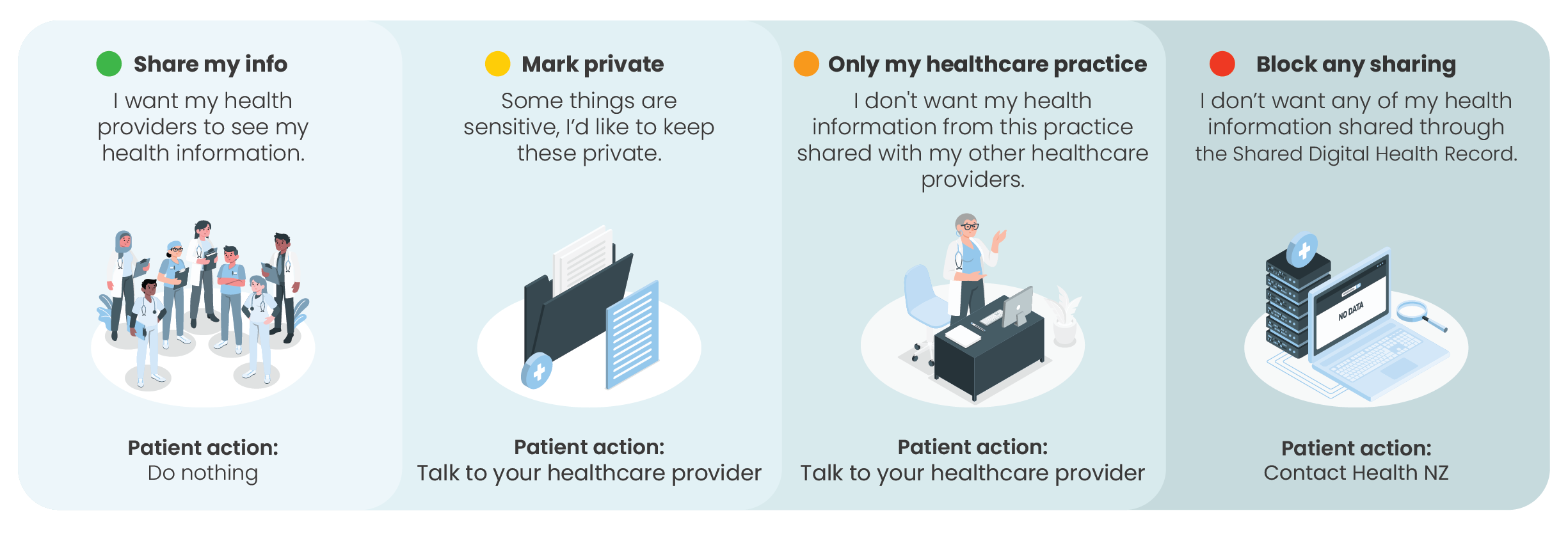 The visual shows the actions you need to take if you want to limit or stop your information from being shared. You can change your sharing preferences at any time. No matter what you decide, you’ll still receive healthcare.